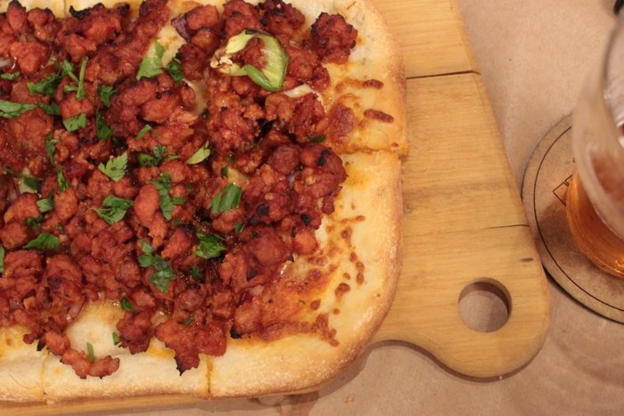 Já estávamos quase derrotados, quando unimos forças e pedimos uma trégua ao menu degustação. Acreditem, pedi uma pizza. Eu não poderia sair do Madre Mia sem provar a pizza deles. Sou food hunter gente! Manu nos indicou a Adeus Chicana - chili de linguiça, pimenta vermelha, cebola roxa, pimenta cambuci e salsa. Ainda bem que eu tive essa idéia do intervalo. A pizza tava demais. Bem picante, mas nada que mais um choppinho não ajude.