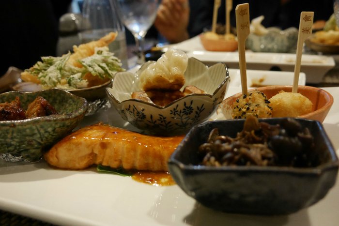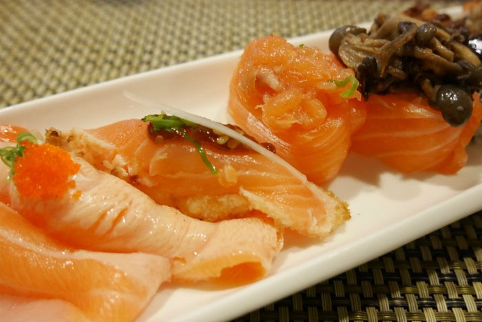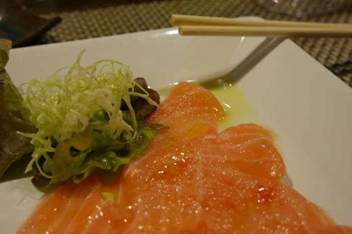 Resolvemos pedir a sequência tradicional (eles oferecem a exótica também) e experimentar vários sabores, dos frios aos quentes. O primeiro prato foi um carpaccio de salmão. Belo começo.