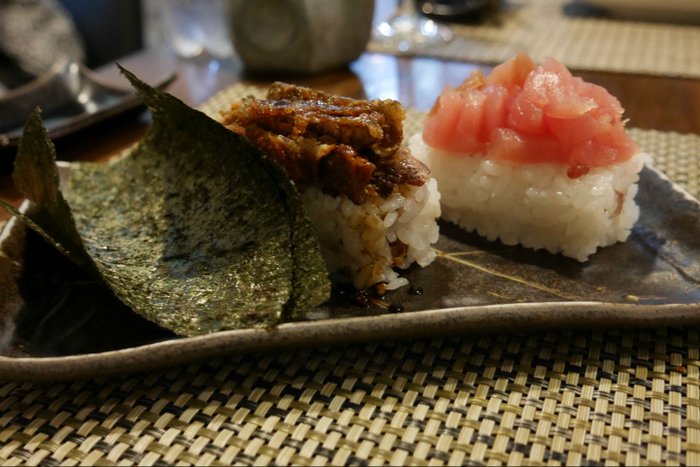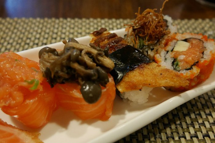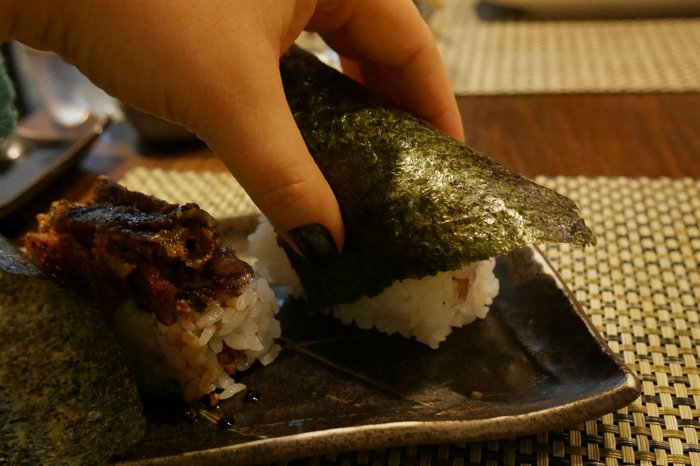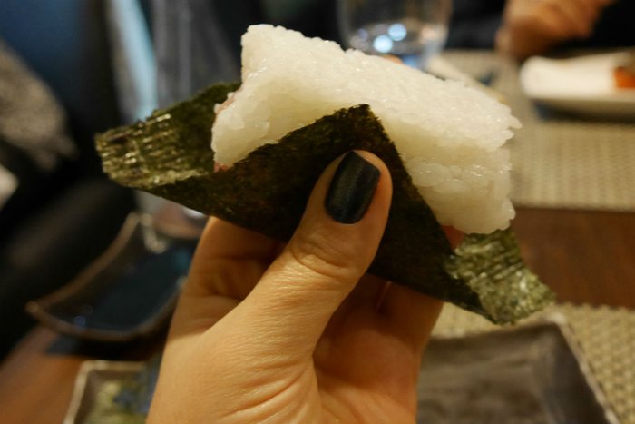 O grande lance aqui é que eles chegaram abertos com a ideia de que cada um fecha o seu. O garçom dá as dicas. Avisa que o peixe deve ficar para baixo. A gente toma coragem e pensa que não, não vai deixar todo o arroz se espalhar pelo chão. Respirei fundo e lá fui eu.
