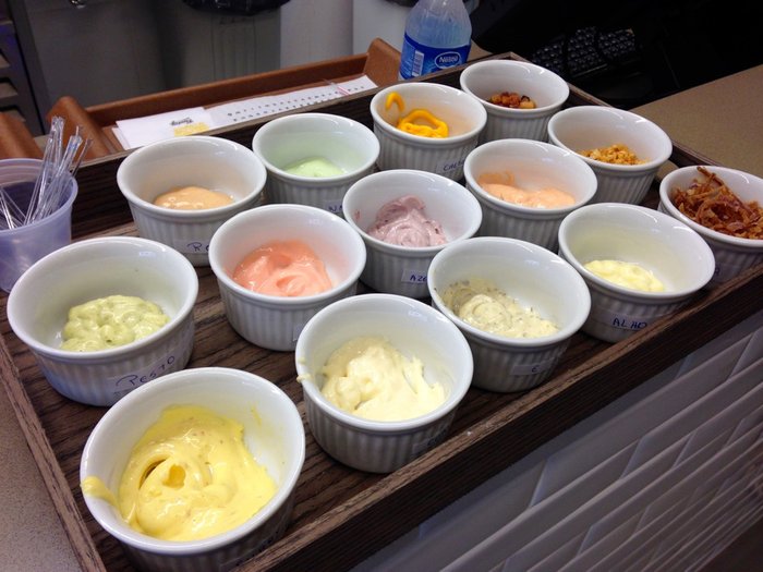 Se você ficar na dúvida de qual molho escolher, não se apoquente, pode provar à vontade! Eu não conseguia me decidir e confesso que provei bem uns dez molhos. Você pode escolher um molho pra batata e um pro cachorro quente. No cardápio eles indicam quais os molhos são apimentados, mas se você está acostumado a comer comida apimentada, nem ligue para as pimentinhas, nada arde de verdade ali. Além do molho, você pode escolher adicionar um topping (bacon, cebola ou alho) ou molho adicional à parte.