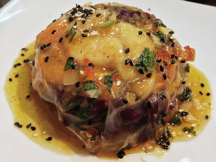 Comecei pela trouxinha de camarão, servida fria como uma salada em apresentacao criativa. A transparência fosca da folha de arroz instigava a curiosidade sobre o colorido dos legumes diversos, gordos camarões e uma provocação quase infantil mediante a um pacote colorido. Com cuidado, abri aquele embrulho e as mordidas revelaram a consistência perfeita de toda composição hidratada por uma farta colherada de molho agridoce com gergelim preto.