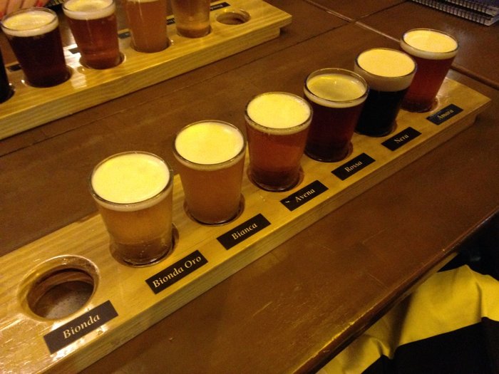 Na dúvida de qual cerveja provar primeiro, não é preciso fica em cólicas, é só escolher a régua de chopp. São 7 chopps de 90ml, um de cada tipo: Bionda, Bionda Oro, Bianca, Avena, Rossa, Nera e Amara. Assim pudemos provar todos para escolher os melhores para tomar em tamanho grande. =) No dia, a Bionda estava em falta, então a garçonete nos trouxe a régua com 5 chopps e disse que traria uma repetição do nosso favorito. Fica a dica: a reposição de estoque ocorre toda quinta-feira, então se você for lá em uma quarta como nós, corre o risco de ficar sem provar alguns dos tipos de cerveja.
