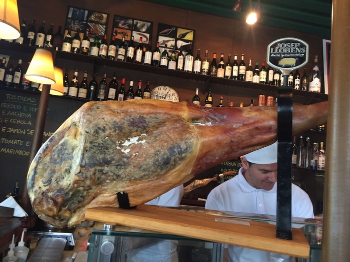 Em cima dessa caixa de ostras fica um enorme presunto cru da Josep Llorens, com pé e tudo.