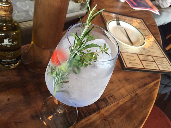 Para começar eu pedi um Gin Tônica Ginebra Mediterrânea. Ele é feito com Gin espanhol e é decorado com raminho de alecrim, tomilho e um tomatinho cereja. Pouco amargo, é bem gelado, suave e refrescante. Uma delícia! O copo é grande e bem servido.