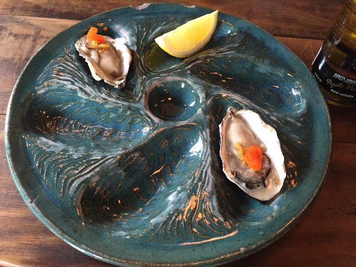 A textura é levemente gelatinosa - muito macia! O molho dá um sabor levemente adocicado, e as ovas trazem uma textura divertida. As ostras são servidas com uma fatia generosa de limão siciliano - ingrediente onipresente nos pratos da Taberna.