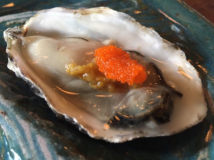 Pedi uma dupla de ostras à moda. Elas vem com molho Yuzu, que é uma fruta cítrica Japonesa e ovas de Massagô. Fresquíssimas, elas tem um gosto delicioso de mar.
