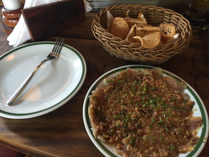 Depois, pedi um cru de sardinha. O prato é temperado com limão, cebolinha, suco de laranja, azeitonas verdes e muito azeite. Sardinha é geralmente vista como um ingrediente menos nobre. Geralmente cobre pizzas com recheios duvidosos e vem em uma lata cheia de óleo e espinhos. Não é o caso dessa sardinha. Ela é FANTÁSTICA! Salgada na medida certa, é um acompanhamento divino para as torradas. Eu não gosto muito de azeitonas, mas elas se encaixam muito bem no prato.