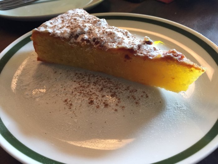 De sobremesa eu pedi um Toicinho do Céu. É uma fatia generosa da sobremesa, coberta com açúcar e canela. Toicinho do céu é uma torta feita com gemas, açúcar e coco. Parece um quindim - o mais gostoso que eu já comi na minha vida! Textura grossa, espessa e cremosa. A sobremesa é até um pouco translúcida. O coco dá um toque muito especial. Açúcar e canela complementam a sobremesa. É de comer rezando de tão bom.