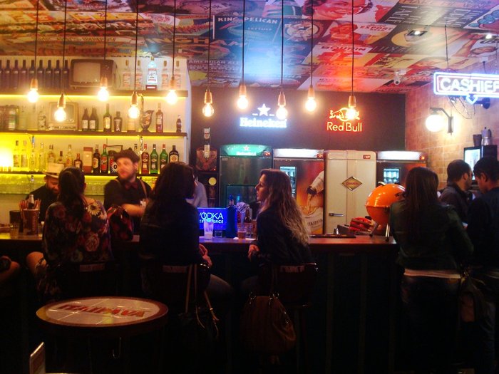 A decoração é ótima, a começar pelo bar: moderno, bem iluminado, colorido e com propagandas de cervejas por todos os lados. A carta de drinks é assinada pelo renomado e premiado bartender, Igor Bispo. O cara já competiu em milhares de campeonatos de coquetéis no Brasil e na América do Sul. Ele também é sócio do Tiger Cocktails que já apareceu aqui no Destemps.