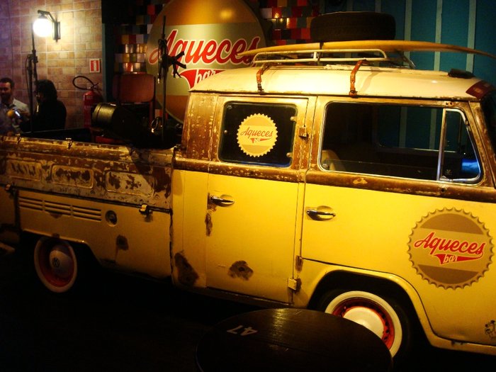 Quando a música começa a rolar, vejo que de frente pro bar tem uma Kombi com uma carroceria equipada com banquinho, mesa de som, microfone e violão para garantir muita diversão até o fim da noite. Quem quiser, pode entrar e tirar uma foto dentro do carro.