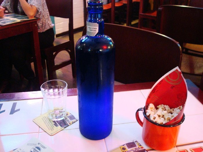 Amigos chegando, sentamos à mesa e fomos recepcionados com uma bela garrafa com água filtrada e uma canequinha com pipoca. Eis aí uma gentileza que se vê pouco por aqui (na Europa, por exemplo, a água é gratuita em quase todos os bares) e que faz toda a diferença na hora de conquistar o cliente.