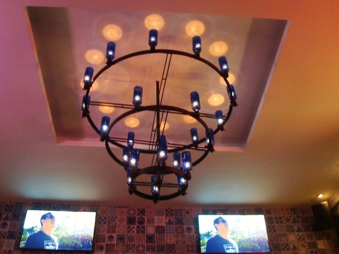 Olhando pra cima, eu percebi que havia mais garrafas só que, dessa vez, como parte do lustre que ilumina discretamente o ambiente. Boa sacada!
