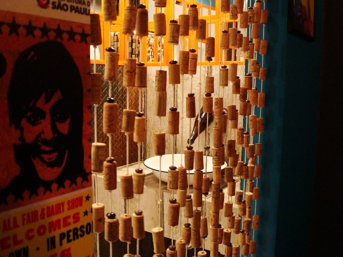 Passando perto do banheiro, detalhes que dão um toque especial. Olha só a torneira e essa cortina de rolhas do lado da pia. Muito vinho pra fazer uma dessas hein!