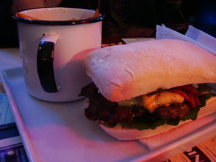 No cardápio tem sempre coisa nova. Todos nós resolvemos atacar o sanduba especial da casa: alcatra grelhada, queijo coalho, pimentões confit, rúcula, maionese de alho e molho pesto. Tudo isso numa ciabatta bem crocante. Receita genial. Acho que eu comeria todo dia! Pra acompanhar, numa canequinha esmaltada, batatas rústicas com sal de páprica.