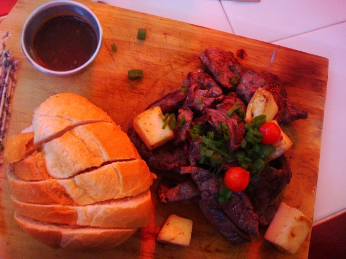 Conversa vai, conversa vem e já bateu aquela fome de novo. Voltamos ao cardápio e escolhemos a alcatra fatiada com queijo coalho e molho de cerveja preta com rapadura. Apesar da boa ideia, confesso que a rapadura passou batido, pois o gosto não apareceu muito para nós. Mesmo assim, vale a pedida, e ainda usar o pãozinho que acompanha pra aproveitar o molho até o final.