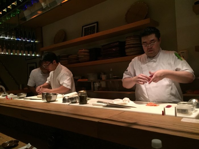 Sentei no balcão, pra assistir os sushimen trabalhando. As facas japonesas são utilizadas com maestria, mas também usam equipamentos mais modernos, como um maçarico para tostar pratos. Eles trabalham em um piso mais elevado que o piso do restaurante, e a iluminação faz a área parecer um palco.