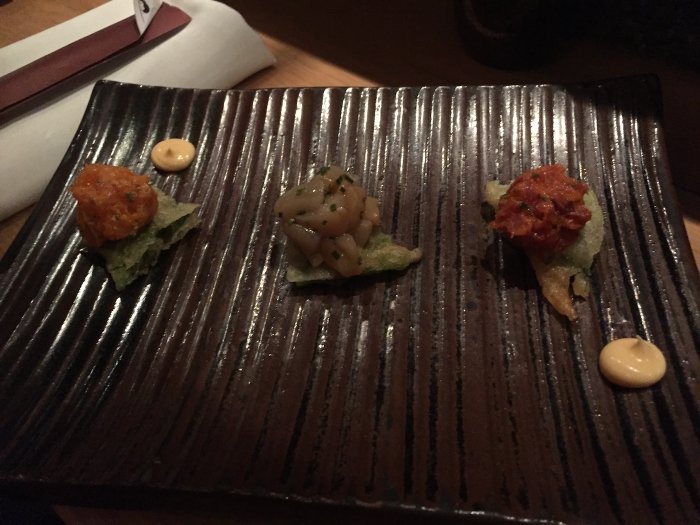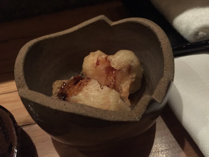 Pedi um trio de Tempurás de Shiso com tartar de atum, salmão e vieiras. Também são comidos com a mão. O tempurá de Shiso é crocante e leve, e tem um sabor muito delicado. O tartar de salmão e o de atum são fantásticos - ligeiramente picantes, derretem na boca. Muito, muito gostoso. As vieiras são preparadas no ponto exato - a textura é fantástica, e elas deslizam para a garganta. Elas tem um sabor um pouco mais pronunciado que o tartar, e assim como todos os cortes do restaurante, são extremamente frescas.