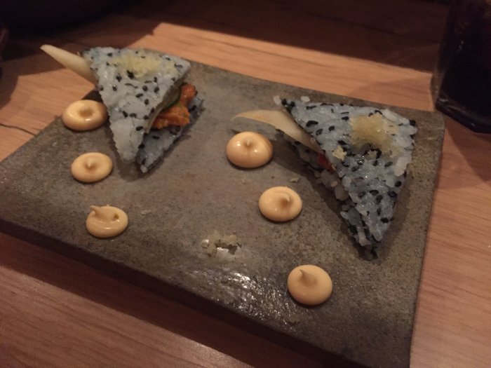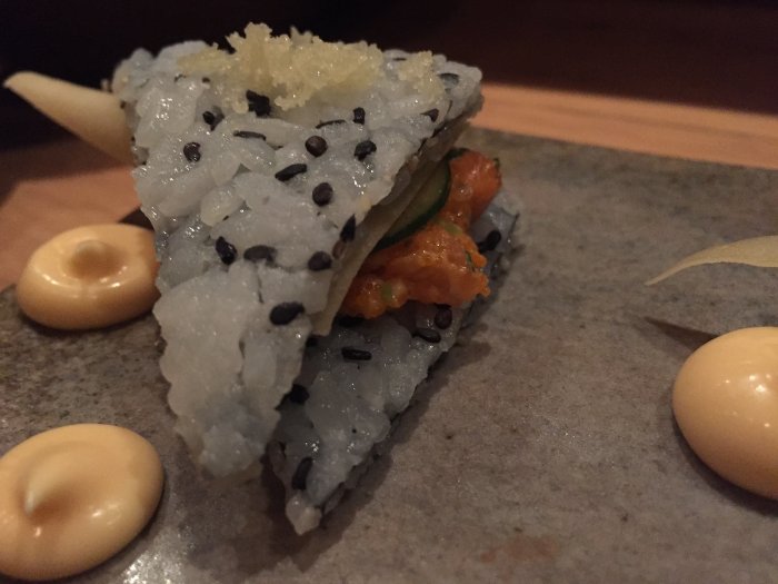 A segunda entrada foi uma dupla de sanduíches, chamados Paninos. O “pão" é uma camada de alga, gergelim e arroz de sushi, e eles são recheados com peixe (no caso, um de atum e um de salmão), massa de rolinho primavera, trufa, maionese picante, pepino e ciboulette. A massa de rolinho primavera é muito crocante, e tem um sabor bem neutro. A maionese picante combina bem com os peixes. É simplesmente divino.
