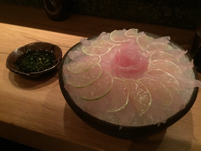 O meu prato principal foi um Ussuzukuri. É uma vasilha cheia de gelo, coberta com camadas finas como papel de peixe e limão. Ele é servido com molho Ponzu, que ainda tem um bom toque de Sriracha e cebolinha. O limão é cortado tão fino que dá pra comer as fatias junto com o peixe. As texturas se complementam, assim como os sabores. É delicioso, e provavelmente um dos peixes mais frescos que eu já comi. O molho é ligeiramente picante por causa da Sriracha, mas também é adocicado e azedinho. Magnífico.