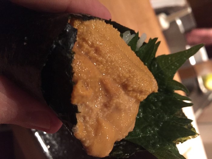 Pedi para arrematar um temaki de ouriço com Shiso. Ele vem enrolado em um quadrado de alga muito fresco. O ouriço é muito cremoso - com um delicado sabor de mar, e uma textura que eu nunca encontrei em outra comida. Não é todo mundo que gosta, mas eu amo. A folha de Shiso crua tem um sabor muito peculiar - azedinha e ligeiramente salgada. É muito aromática. O arroz é temperado na medida exata e é muito macio. O temaki é enrolado bem solto, para não esmagar o arroz, então você precisa segurar pra ele não desmanchar. Vem acompanhado de wassabi e um gengibre muito gostoso.