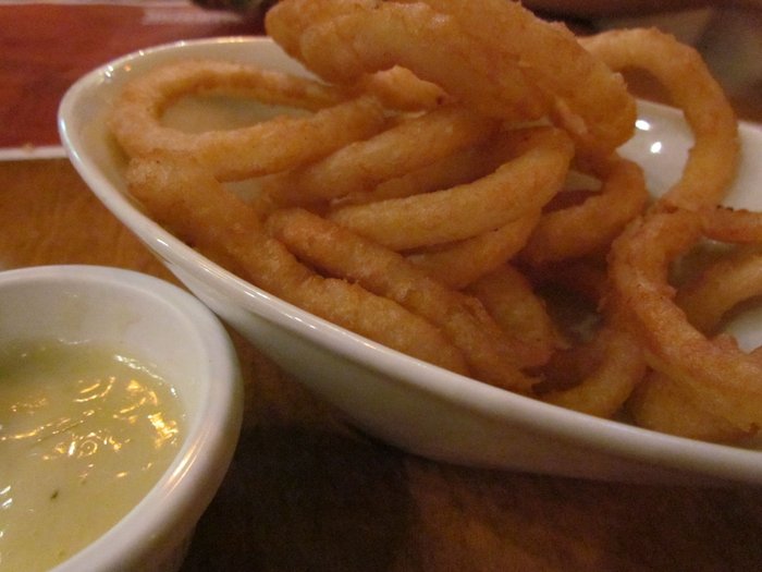 Os amigos, que chegaram atrasados e com bastante fome, já foram mandando o pedido: onion rings com molho aioli. Bem sequinhos os anéis de cebola.
