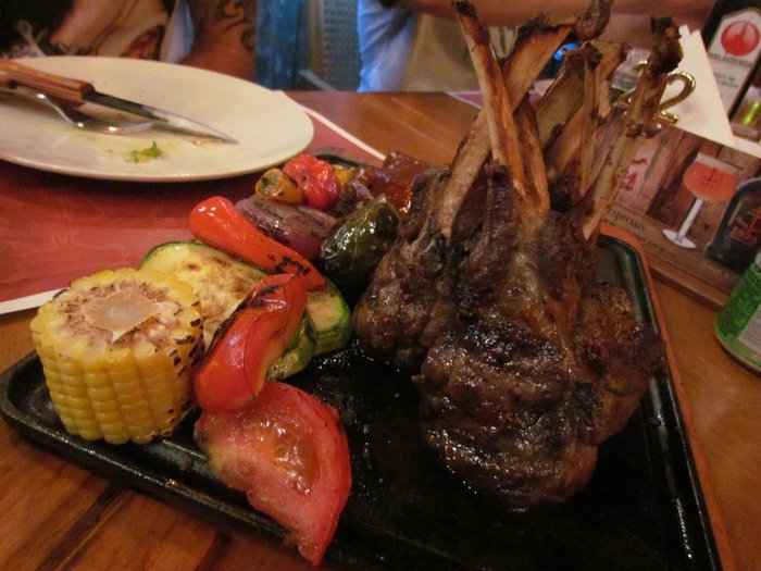 Hora dos pedidos principais! Estávamos em um grupo de sete pessoas, então deu pra provar um pouco de tudo que a casa oferece (juuuuuro que não coagi os amigos a fazerem pedidos diferentes só pro meu post ficar legalzão). O Henrique provou o carré de cordeiro, que vem acompanhado de legumes grelhados. Todas as carnes vem, na verdade.