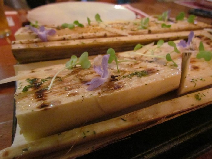 Desde que eu tinha colocado os olhos no palmito pupunha no menu, eu fiquei louca para provar. Eu amo palmito! Esse, assado na brasa, com manteiga de ervas e queijo grana padano, tem o sabor um pouco diferente. Como eu nunca havia provado o pupunha, achava que ia ser tipo esses que a gente come em conserva, rsrs. Quanta ignorância a minha. É bem diferente; mais durinho, menos saboroso. Enfim, valeu a experiência. Ele era gigante e deu para todos na mesa provarem um pedacinho.
