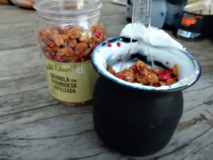 Começamos com iogurte maravilhoso de Limão misturado com a Granola com Framboesa liofilizada. Sensacional. Não sabia o que era Liofilização, mas descobri. É uma técnica moderna de desidratação dos alimentos, em que os mesmos são submetidos a baixas temperaturas sem perder as propriedades do produto original, tais como os valores nutricionais e vitamínicos.