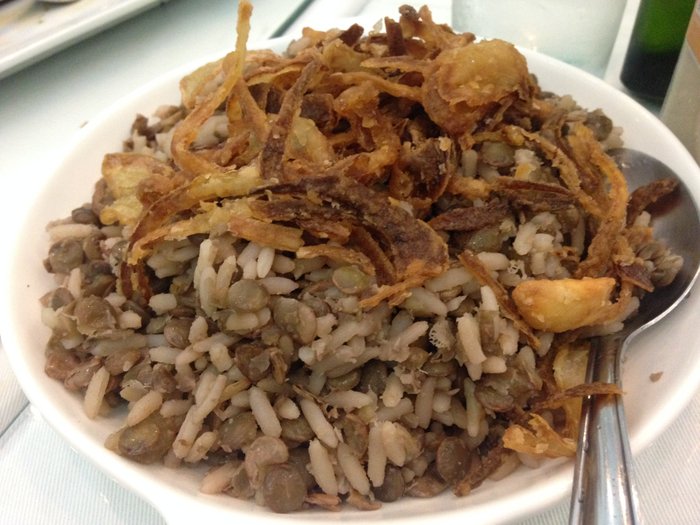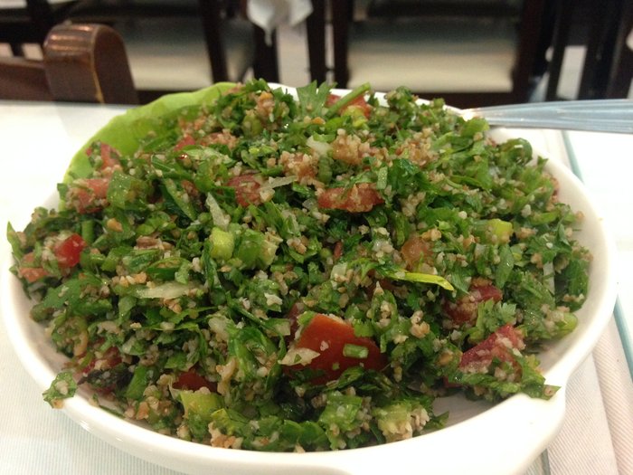 Depois da acalmada no estômago fomos destrinchar o cardápio. Tava difícil decidir. Eu queria o tabule, mas a minha amiga queria o arroz com lentilha. Árdua argumentação na mesa, pois éramos duas e não queríamos desperdiçar comida. A garçonete veio ao nosso socorro e falou: “Simples gente. Aqui tem meia porção!”. Momento ufa. Desce para gente então uma meia porção de tabule: Lindoooooo! Tava namorando ele na mesa do lado. Um arroz com lentilha e a cebola sequinha.