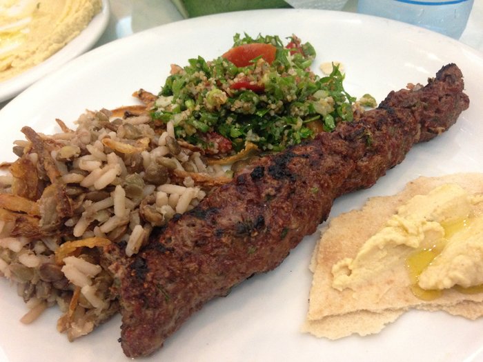 Essa cebolinha é uma coisa divina, pode falar. E uma Kafta de carne. Pega tudo e mistura no prato. Coloca azeite, pega um pãozinho árabe e deleite-se!