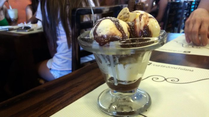 Servida numa taça de sundae, a torta é composta por uma porção de massa sabor chocolate, leite em pó, Nutella cremosa e bolas de sorvete de creme por cima. A combinação final de sabores é bem equilibrada, pois o sorvete de creme é suave não deixa a sobremesa tão doce. Só senti falta de um pouco mais do sabor da Nutella.