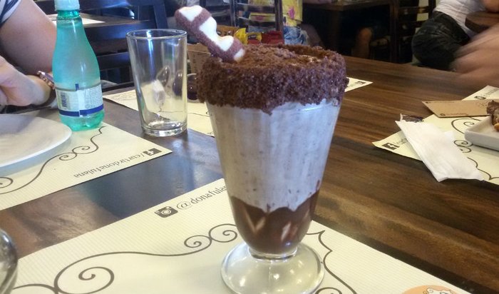 Fechando a sequência de doces veio o milk shake, outra especialidade da casa, no sabor ovomaltine com Kinder Bueno. Olhando a taça parece um exagero, mas é só provar pra você ter certeza de que vai dar conta do recado. Não recomendado para os que gostam moderadamente de doce.