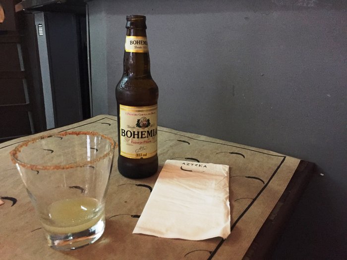 Pra abrir os trabalhos, uma chelada (cerveja + suco de limão +sal apimentado na borda). Arriba, muchachos!