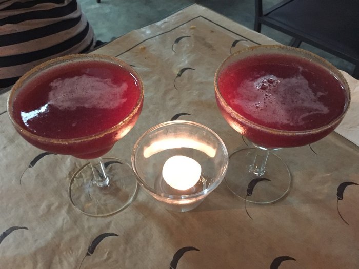 Trabalhos abertos, hora de partir para drogas mais fortes. Eis que no cardápio tem uma inusitada margarita de hibiscos. Encontrei meu drink favorito na vida! O sal apimentado na boca do copo é o complemento perfeito. Amei!