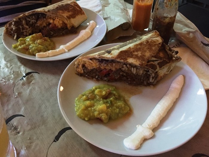 E como amamos muito o drink e não ficamos na primeira rodada, precisávamos comer mais. As possibilidades eram várias, mas fomos de burritos Durango - guisado de carne bovina desfiada ao molho de guajillo (um tipo de pimenta). Vem acompanhado de sour cream e guacamole. Como íamos dividir o prato, a garçonete já trouxe dividido, uma gentileza. Que tempero gostoso! E quanto recheio!