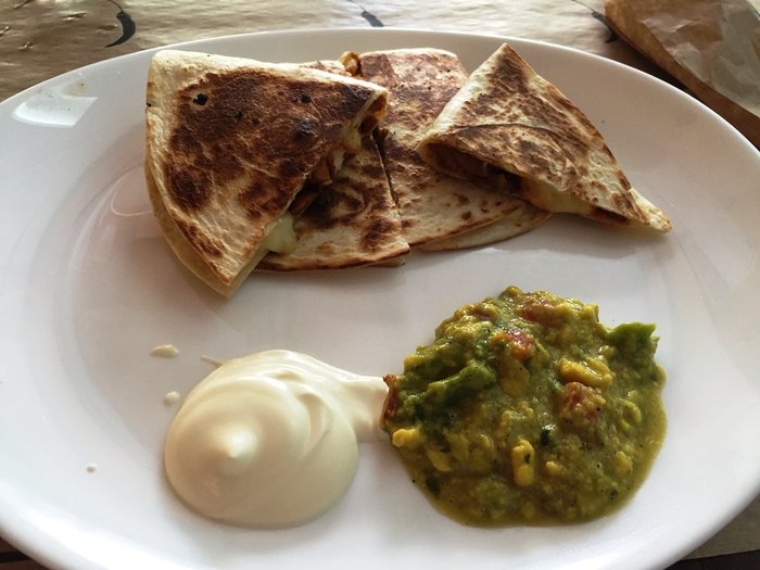 E para comer, quesadilla Al Pastor, de pernil suíno tradicional com abacaxi. Também super temperada, deliciosa. Acompanhada de sour cream e guacamole. Os vegetarianos ou com intolerância ao glúten podem ficar sossegados, há diversas opções no cardápio!