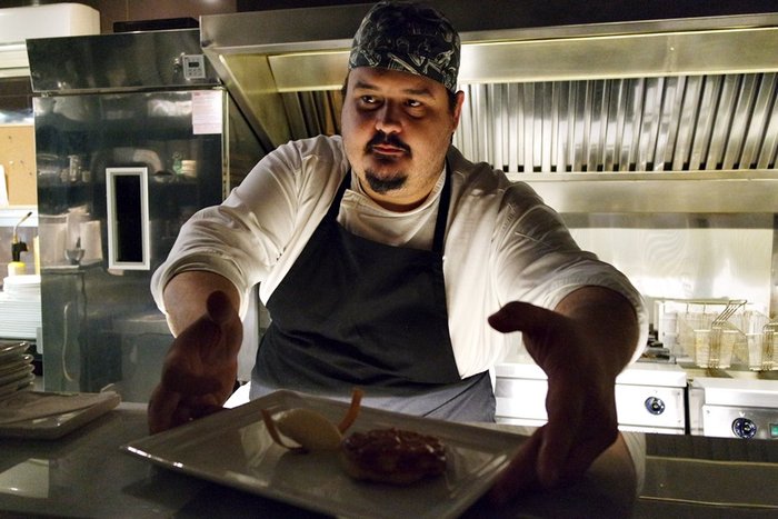 Olha aí o chef Gabriel Zambon aprontando uma das sobremesas do cardápio! O menu conta com três opções de entrada, três opções de prato principal e três opções de sobremesa, que vão variando de tempos em tempos, segundo a sazonalidade dos ingredientes. Ponto pra eles!