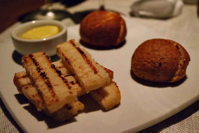 Logo que fizemos os pedidos dos três pratos do menu principal, chegou à mesa o couvert, uma seleção de pães com manteiga caseira. Quentinhos e saborosos, com a manteiga que derretia na boca.