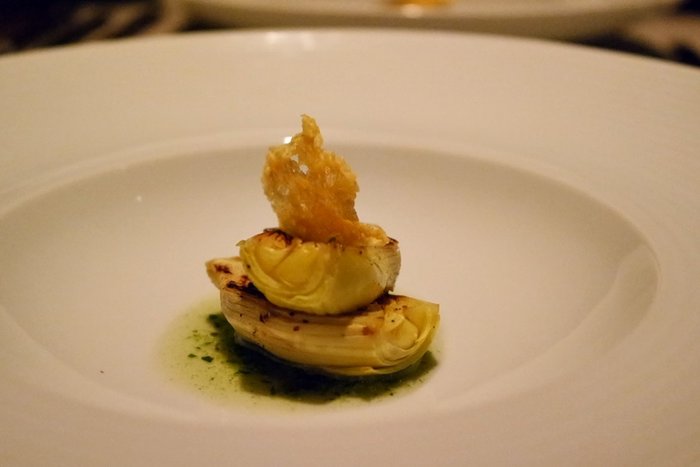 Em seguida, foi a vez do amuse buche, uma alcachofra grelhada ao pesto. Não costumo curtir molho pesto porque acho gorduroso, mas esse estava fora de série. E a alcachofra veio com aquele sabor de tostado da grelha, incrível.