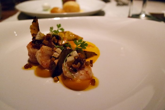 Melhor avisar logo que os pratos são bem servidos e é impossível sair com fome de lá, muito pelo contrário. Uma das entradas pedidas foi o camarão na moranga, uma releitura com gelatine de camarão, camarão grelhado e purê de moranga com leite de coco. Pensa num prato saboroso. Agora multiplica isso por cinco.