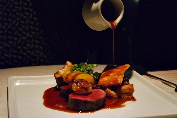 Eis, então, o filé de angus com massa folhada recheada de cogumelos grelhados e purê de cebola. Eu sou suspeita para falar dos pratos criados pelo Gabriel, todos incríveis, nos sabores e nas texturas.