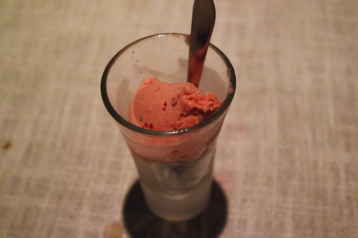 O vinho combinou perfeitamente com todos os pratos, e eu estava com a alma aquecida e feliz da vida. Mas ainda era hora da sobremesa. Antes de mais nada, um sorbet de ameixa para limpar o paladar.