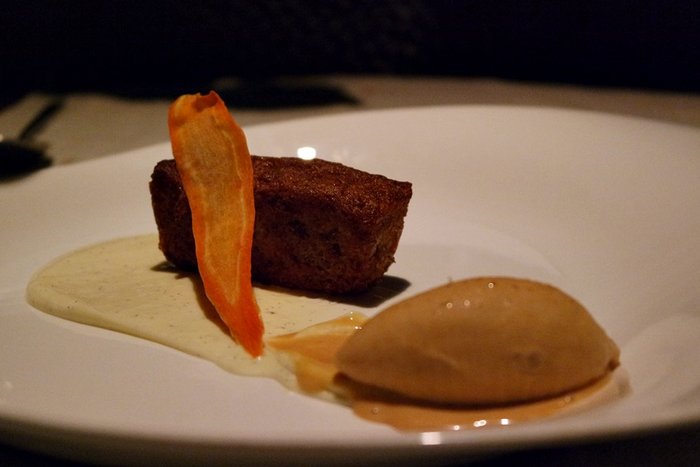 Era a hora do bolo de cenoura com especiarias, acompanhado de cream cheese de baunilha e sorvete de caramelo com flor de sal. De chorar de tão bom!