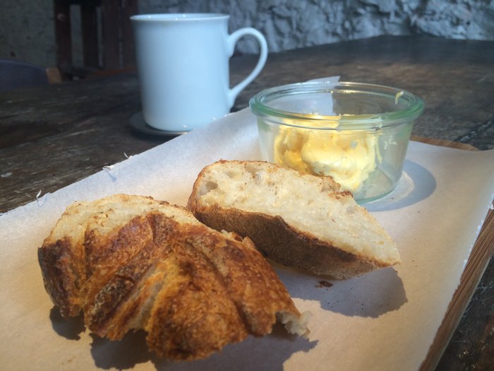 E, no meio desse mundo de pão, eu confesso que fiquei perdida. Meu pai deu a ideia de gênio: pedir um pão com manteiga (nesse caso o pão foi o Rio Sourdough). Posso contar para vocês que estava quentinho naquele ponto que manteiga derrete. Casca de verdade, mais grossa, e com o miolo bem aerado. Sem teorizar: tava bom! Reparem ao fundo o nosso café no aeropress dando um charme à foto.