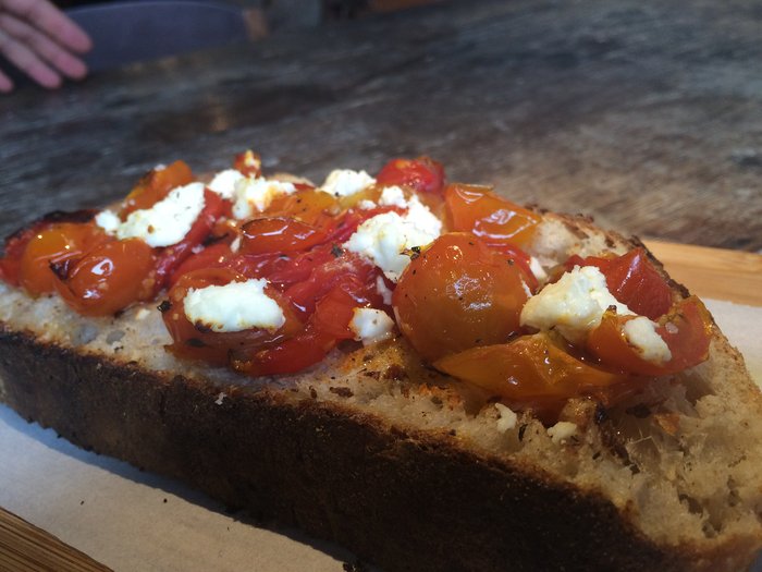 Papai pediu o Tartine de tomate e queijo de cabra. O clássico “pão, tomate e queijo” ganhou o meu coração. Estava um pouquinho melhor que o meu, mas a minha paixão por tomate assado me entrega. Estrelinhas para os nossos tartines.