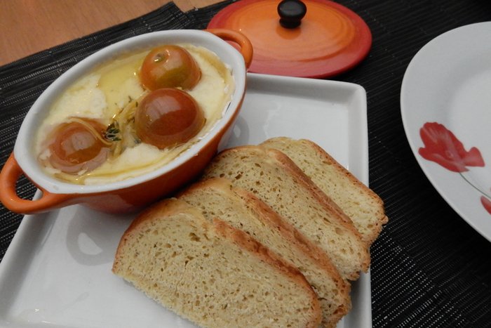 Primeira opção de entrada, Le Fromage Grillê - nada mais que um queijo brie derretido com azeite aromatizado e tomate confit acompanhado do pão da casa (que é de milho e sensacional). Ótima escolha. Difícil errar num brie derretido, mas tudo combina demais.
