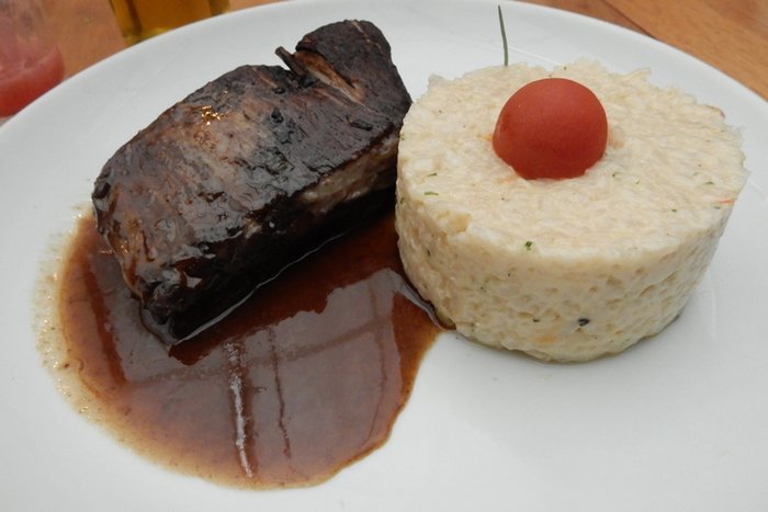 Outra pedida foi a Costela Suína ao molho de vinho tinto servida com risoto de parmesão. O molho super brilhoso e suculento.