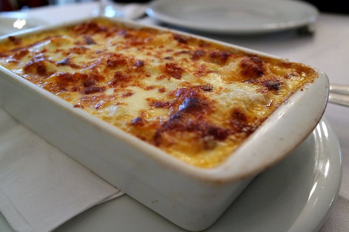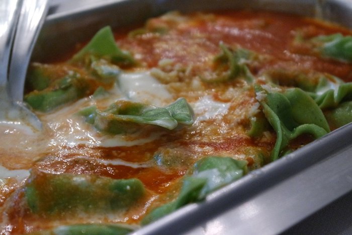 Meu pai escolheu a lasanha de carne. Incrível! Reparou no tamanho das porções? São enormes!