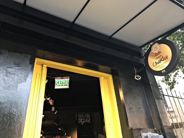 Localizado em um antigo casarão na Cidade Baixa, que foi todo reformado para ficar com a cara da Charlie, o pub é também uma cafeteria. Logo na entrada, o ambiente é muito parecido com a primeira loja. Mesa compartilhada e brownies e produtos espalhados na parede.