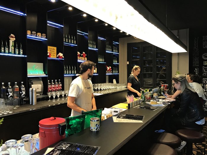 Mas e o pub? Oras, vamos para o segundo andar? Porque subindo as escadas nós damos de cara com esse balcão incrível. Você pode escolher entre sentar nas mesas ou no balcão, mas é bem mais legal acompanhar o trabalho do pessoal de perto, né?